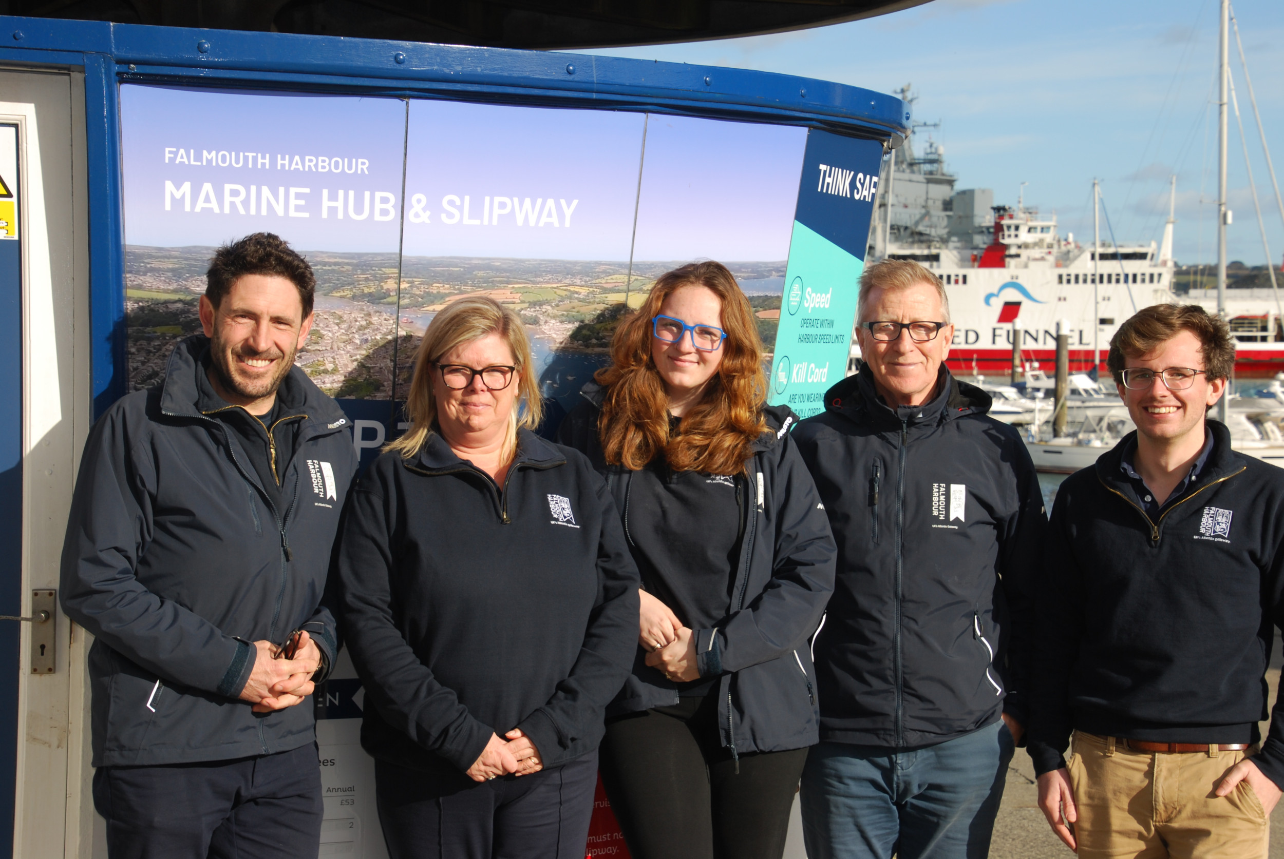 Falmouth Harbour Leisure Team L-R Head of Commercial Operations Tristan Rowe, Leisure Coordinator Sue Cocks, Duty Marina Manager Daisy Gould, Marine Hub Manager David Chaundry & Moorings Officer Charlie Whelan