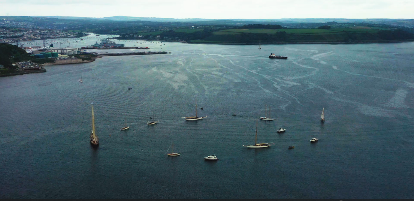 As they left Falmouth the Richard Mille Cup fleet of pre-war classics gathered to commemorate the 80th anniversary of the D-Day embarkations – drone aerial courtesy of Classic Regattas