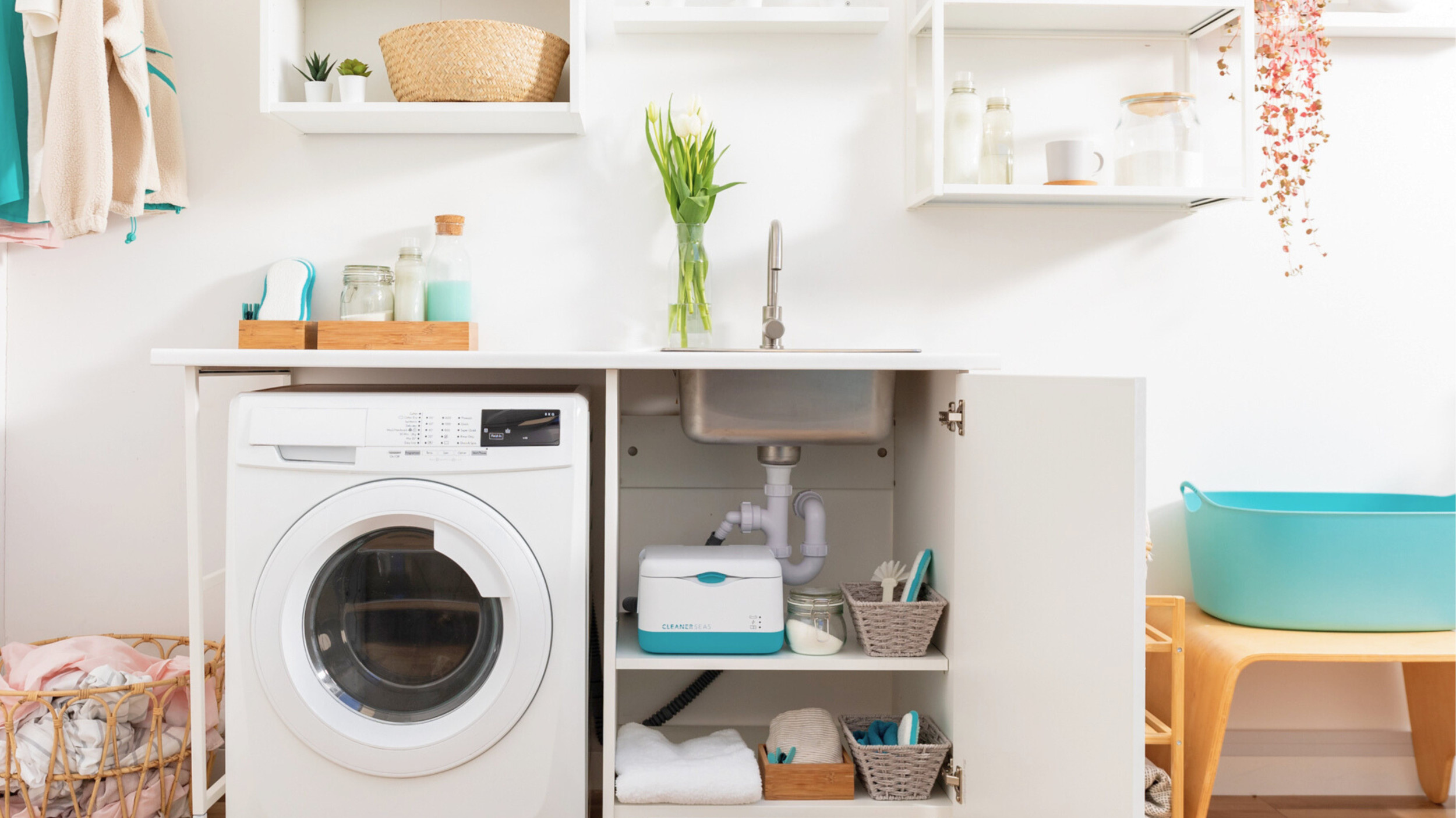 Cleaner Seas Group Indi microfibre filter unit attached to a domestic washing machine. Photo – Cleaner Seas Group